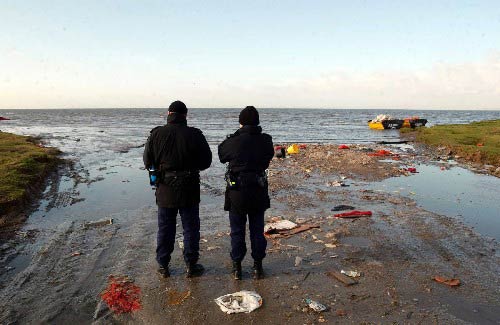 2月6日,兩名警察站在英格蘭西北部莫克姆灣海灘。據(jù)英國警方和中國駐曼徹斯特總領(lǐng)事館提供的最新消息,5日晚被困在莫克姆灣海灘的被認為是中國人的30多名撿拾貝類者中,目前已有19人死亡,14人獲救,另有數(shù)人下落不明。新華社/法新