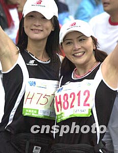 “渣打馬拉松2004”二月八日在香港舉行,萬人冒雨參加了比賽,圖為兩名參賽女士賽后興高采烈拍照。 作者:錢興強