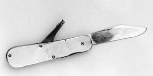 這把杜月笙生前所用的小手槍形似水果刀。杜月笙原本是水果攤學(xué)徒出身,擅削梨子,平時(shí)喜歡把玩削梨小刀。所以沒(méi)有人想到他手中的這把“水果刀”其實(shí)是一把微型手槍。這支6.35mm口徑的微型槍是在瑞士定造的,可以填裝一發(fā)子彈。杜月笙就可利用削水果的動(dòng)作麻痹對(duì)方,然后出其不意擊發(fā)。兩米之內(nèi)具有絕對(duì)的殺傷力。