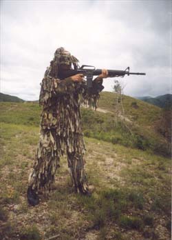 我記得教官在訓(xùn)練前曾說過:“子彈只找不長眼的人!毕氲竭@里,我采取聲東擊西的戰(zhàn)術(shù),隨手撿起一塊石頭,朝我相反的方向扔去,爾后乘機(jī)迅速滾進(jìn)眼前一條戰(zhàn)壕掩體內(nèi),繼續(xù)前進(jìn)。當(dāng)“守?cái)场痹俅伟l(fā)現(xiàn)我的行蹤時,我又用一根樹枝挑起帽子,隱真示假、吸引火力,突然轉(zhuǎn)移。接敵時,我冒著火光沖天的爆炸,時而快速通過獨(dú)木橋,時而匍匐穿過鐵絲網(wǎng),時而快速繞過雷場區(qū),終于在“守?cái)场辈贾玫奶炝_地網(wǎng)中死里逃生。然而,當(dāng)我出其不意地繞到“守?cái)场北澈螅舐暫暗溃骸安辉S動,繳槍不殺!”時,只見那些蒙面“守?cái)场保娂娕み^頭,不是舉手投降,而是向我伸出了大拇指。正當(dāng)我納悶時,他們紛紛卸下面紗,這時我才發(fā)現(xiàn)眼前的“守?cái)场,竟是與自己朝夕相處的教官、軍曹和勤務(wù)兵。