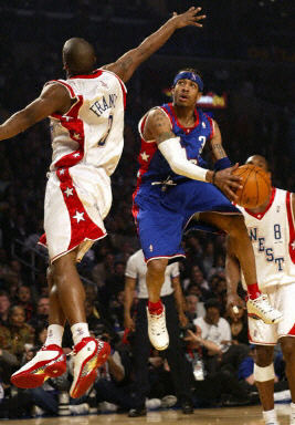 洛杉磯湖人隊的艾弗森在對戰(zhàn)西部全明星隊的弗朗西斯,兩名小個子球員上演空中舞蹈。