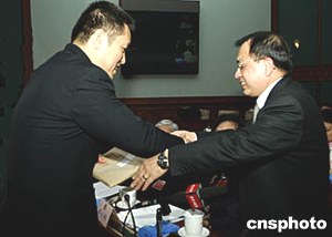 北京政協(xié)的香港、澳門(mén)委員2月17日與北京市代市長(zhǎng)王岐山等高官座談。不少委員均關(guān)注正月十五密云發(fā)生的多人死亡事件,香港的馮柏棟委員(右)向北京市副市長(zhǎng)張茅遞交了香港處理1993年蘭桂坊元旦悲劇調(diào)查及改進(jìn)方案。中新社記者:任晨鳴