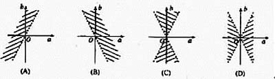 此題的完整解是(—b—>2—a—,且a≠0)。{證明:函數(shù)y=ax2+bx+a的圖像與x軸有兩個(gè)交點(diǎn),就是方程ax2+bx+a=0有兩個(gè)不同的實(shí)根。其充分必要條件是a≠0,且b2>4a2。即(—b—>2—a—,且a≠0)。}在圖A、B、C和D中,凡虛線均表示不屬于區(qū)域的邊界,凡相鄰而不同斜率的陰影線均表示相鄰而不連通的區(qū)域,這是符合慣例的。[關(guān)于區(qū)域的定義,可見《數(shù)學(xué)》,第二冊(cè)(上),普通高級(jí)中學(xué)教科書,p.58: