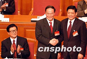 二月二十一日,王岐山(中)在北京市十二屆人大二次會議上以高票當(dāng)選北京市市長,中共北京市委書記劉淇(右)、市人大委員會主任于均波向王岐山表示祝賀。中新社記者:張宇