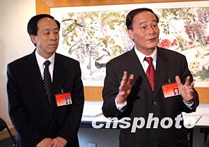二月二十一日,王岐山(右)在北京人大會議選舉市長投票結(jié)束后,看望議案組工作人員。中新社記者:張宇