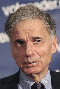 本周即將年滿七十的納德二000年曾經(jīng)以綠黨候選人的身份參與總統(tǒng)大選角逐,雖然僅獲得百分之二點(diǎn)七的選票,但因?yàn)椴际苍诜鹆_里達(dá)和新罕布什爾兩州僅以微弱的優(yōu)勢(shì)壓倒戈?duì)枺〉眠@兩州的選舉人票而登上總統(tǒng)寶座,民主黨人認(rèn)為納德的得票分流了本來(lái)支持戈?duì)柕倪x民,導(dǎo)致戈?duì)柭鋽 ?div align="left">