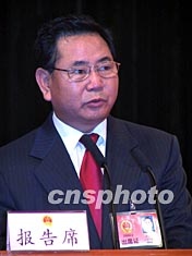 海南省三屆人大二次會議二月二十四至二十八日在?谂e行,會議將選舉產(chǎn)生省長。圖為代省長衛(wèi)留成在會上作政府工作報告。作者:王辛莉