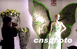 2004年2月25日,參觀者被第五屆中國(上海)國際婚紗攝影及器材展覽會中時尚的婚慶櫥窗吸引。一家公司在展會中推出了許多浪漫風格的婚紗店櫥窗布置,透露出濃濃的時尚氣息。中新社傳真 井韋 攝