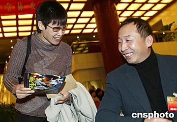 全國(guó)政協(xié)委員、導(dǎo)演馮小寧,二日在北京向剛剛報(bào)道的世界速滑冠軍葉喬波委員贈(zèng)送他的新影片《舉起手來》海報(bào)。該片號(hào)稱是中國(guó)版的《虎口脫險(xiǎn)》,是馮小寧推出的一部戰(zhàn)爭(zhēng)喜劇大片。中新社記者:滿會(huì)喬