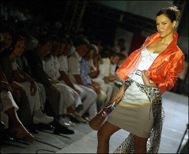 面對(duì)著6組射程在38公里的“飛魚(yú)”導(dǎo)彈的發(fā)射裝置,在2門(mén)100毫米口徑的自動(dòng)炮的下面,一條長(zhǎng)達(dá)40米的白色塑料毯上,模特們展示著各名家的服裝作品。
