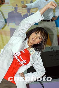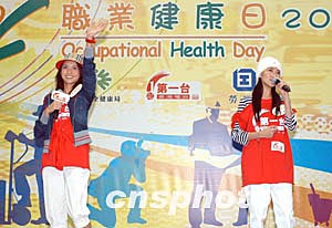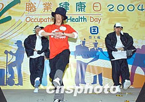 歌星何韻詩(shī)3月6日在香港出席由職安局及勞工處舉辦之《職安健康日2004》開(kāi)幕典禮活動(dòng),「職安領(lǐng)隊(duì)」何韻詩(shī)帶領(lǐng)出席嘉賓及歌星進(jìn)行健康操,宣揚(yáng)職業(yè)安全信息。作者:鄧慶樂(lè)