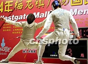 三月八日,中國“劍客”董兆致(左)在上海梅龍鎮(zhèn)廣場舉行的二○○四國際劍聯男女花劍世界杯大獎賽男子個人花劍決賽中,擊敗德國的Bissdorf Ralf獲得冠軍。作者:湯彥俊