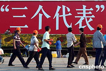 十屆全國人大二次會議三月十四日對憲法修正案草案進(jìn)行表決,“三個代表”重要思想正式寫入中國新憲法。圖為北京天安門廣場上的“三個代表”巨幅標(biāo)語牌。中新社記者:張煒