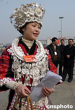 十屆全國人大二次會(huì)議十四日在北京閉幕,來自貴州的少數(shù)民族代表盛裝出席閉幕式。中新社記者:張勤