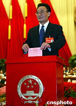 十屆全國(guó)人大二次會(huì)議三月十四日在北京人民大會(huì)堂舉行閉幕式,全國(guó)人大常委會(huì)委員長(zhǎng)吳邦國(guó)投票表決“憲法修正案草案”。中新社記者:毛建軍