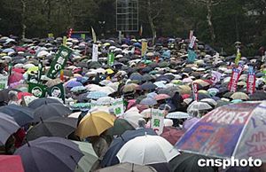 數(shù)萬日本民眾三月二十日在東京舉行反戰(zhàn)集會,他們高舉標(biāo)語牌要求日本自衛(wèi)隊從伊拉克撤兵。作者:王健