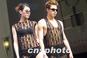 2004高級(jí)內(nèi)衣流行趨勢(shì)發(fā)布會(huì)三月二十二日晚在上海世貿(mào)商城舉行,男女模特展示一款網(wǎng)式情侶內(nèi)衣。作者:湯彥俊