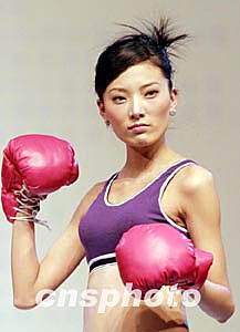 2004高級內(nèi)衣流行趨勢發(fā)布會三月二十二日晚在上海世貿(mào)商城舉行,一模特身穿運動型內(nèi)衣、手帶拳套,試圖表現(xiàn)力與美的境界。 湯彥俊 攝