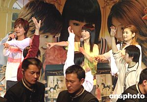 三月二十五日,近來十分走紅的少女組合S.H.E來北京舉辦歌迷簽唱會(huì),現(xiàn)場(chǎng)火爆異常,主辦方出動(dòng)大批保安維持現(xiàn)場(chǎng)秩序。作者:高遠(yuǎn)