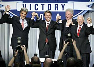克里已獲得了他初選最強有力競爭者前佛蒙特州長迪安的支持。其它在初選與克里競選的候選人如克拉克將軍、前北加利福尼亞愛德華茲參議員都已向支持者發(fā)去電子郵件,請求他們向克里的競選活動捐款。