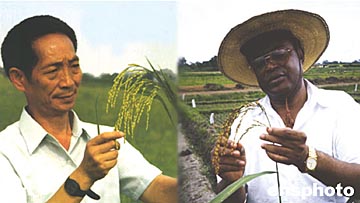 被稱為中國“雜交水稻之父”的袁隆平教授和來自塞拉利昂的瓊斯博士因在培育高產(chǎn)水稻方面的杰出貢獻,29日在美國首都華盛頓被授予二00四年度“世界糧食獎”,兩人分享二十五萬美元的獎金。中新社圖