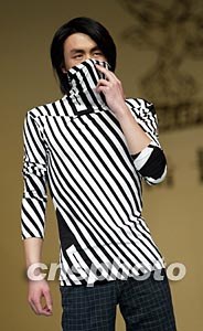 EAGLEPTY休閑裝發(fā)布會三月三十一日在北京國際時裝周上舉行,模特展示一款設(shè)計簡練卻充滿前衛(wèi)風(fēng)格的設(shè)計。中新社記者:毛建軍