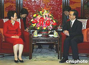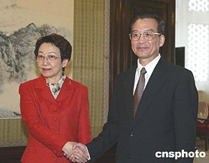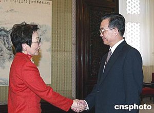 中國國務(wù)院總理溫家寶四月三日在北京中南海會(huì)見日本外相川口順子。中新社記者:滿會(huì)喬