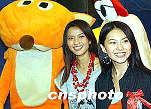 香港樂壇組合人氣姊妹花2R,四月四日參加粉嶺商場(chǎng)舉行的歡慶復(fù)活節(jié)活動(dòng),圖為2R與AeKiDs動(dòng)畫人物一起拍照。 作者:錢興強(qiáng)