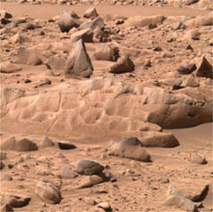 勇氣號(hào)今年1月3日登陸火星Gusev環(huán)形山,科學(xué)家認(rèn)為這里曾經(jīng)是一個(gè)湖泊,F(xiàn)在,勇氣號(hào)正在向著一個(gè)丘陵區(qū)挺進(jìn),在那兒,可能會(huì)有證明火星曾是一個(gè)濕潤(rùn)星球的地質(zhì)證據(jù),包括一些由液態(tài)水沖刷而形成的沉積巖。