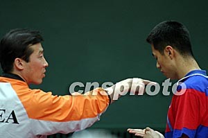 四月十日晚在北京海淀體育館舉行的奧運(yùn)會(huì)乒乓球亞洲區(qū)預(yù)選賽中,中國(guó)小將王皓以4-1戰(zhàn)勝韓國(guó)選手朱世赫。圖為金澤洙在場(chǎng)邊為朱世赫進(jìn)行現(xiàn)場(chǎng)指導(dǎo)。中新社記者:盛佳鵬