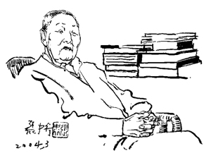 3月18日,入春后一個晴暖的日子,父親說,去看看張中行吧。先打了電話過去。當我們下午3時準時叩開張中老的家門時,他的女兒邊迎我們進屋邊說:“我父親早就在書房等著了,還問,這父子倆怎么還沒來?”在朝東的那間僅有七八平方米的書房里,張中老正安坐在書桌前的藤椅上。他看上去精神不錯,氣色也挺好。只是因近兩年行動困難而少活動,加上老年性嗜睡,臉龐有些虛胖,舉止有些遲緩。問起近況,得知剛年過九五的張中老每天尚能依杖在屋里慢慢走走,偏愛甜食,飯量已不如從前。這天,當張中老為這幅畫像題字時,感到他握筆顯得有點費力,寫出的字跡也有些抖顫。見狀,不禁生出歲月無情之嘆。自2000年擱筆后,老人最大的樂趣就是聽京戲,偶爾翻翻閑書。我隨手拿起書桌上放大鏡旁邊放著的一本刊名《開卷》的裝幀素樸的小開本雜志翻看,見上面有張中老的朋友范用等人寫的文章。由此引出張中老的一個話題。他慢慢說道:“現(xiàn)在有人辦雜志,盡愛登一些讓人讀不懂的文章。創(chuàng)辦過《讀書》雜志的范用就講,有本原來文風不錯的雜志,現(xiàn)在登的文章就連他都看不明白了,那還看它干什么。”這段話使我聯(lián)想起閱讀張中老的書,總會覺得仿佛是在和這位仁厚的老人一同負暄,聽他用淺近易懂又含蘊深厚的話語向你娓娓講述悠遠的故事和做人的道理。再問起張中老坐下的藤椅,沒想到老人對幾十年前的舊事仍記得真真兒的:“我記得是民國二十一年(1932年)買的,還記得是在離沙灘北大紅樓不遠的八面槽買的”。算算這把藤椅已伴隨他72年了。細看老人在扶手處纏繞的白塑料繩早已磨出了一片片毛茬。