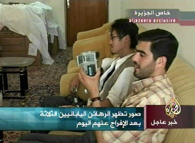 最早的消息來(lái)自今晚半島電視臺(tái)的報(bào)道,日本各大電視臺(tái)紛紛于第一時(shí)間轉(zhuǎn)播其有關(guān)消息和圖像。消息說(shuō),三名日本人被當(dāng)?shù)氐哪滤沽珠L(zhǎng)老會(huì)所保護(hù),目前身體情況良好。電視鏡頭顯示三名日本人在一個(gè)比較寬松的環(huán)境中與伊拉克當(dāng)?shù)厝耸枯p松交談,應(yīng)該是脫離了險(xiǎn)境。
