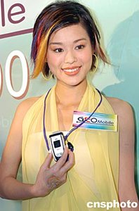 藝員胡杏兒4月16日在香港出席韓國GEO Mobile最新推出的潮流手機GC800發(fā)布會,胡杏兒為GEO Mobile代言人,以嶄新彩色駁發(fā)形象,與兩位人體彩繪舞蹈員共同展示GC800新手機。作者:鄧慶樂