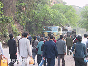 四月十八日下午六時(shí)許,離事發(fā)地中央核心區(qū)域僅兩公里的螞蝗梁拉起的警戒線終于撤下。疏散出去的附近居民歸心似箭,快步走在回家的路上,今天排險(xiǎn)過程中發(fā)炮的坦克吸引了他們.十五日晚,重慶天原化工總廠發(fā)生氯氣泄漏事件。作者:郭晉嘉 郭虹