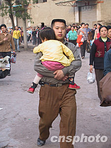 四月十八日下午六時許,離事發(fā)地中央核心區(qū)域僅兩公里的螞蝗梁拉起的警戒線終于撤下.疏散出去的附近居民歸心似箭。圖為一位父親抱著年幼的女兒快步走在回家的路上。作者:郭晉嘉 郭虹