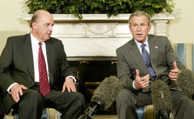 4月19日,美國總統(tǒng)布什(右)在白宮舉行儀式,提名美國常駐聯(lián)合國代表內格羅蓬特(左)在6月30日伊拉克權力交接后出任美國首任駐伊大使。該任命還將通過參議員的審議。內閣羅彭特現(xiàn)年64歲,將在6月30日美伊交權后走馬上任。