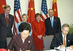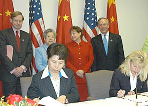 四月二十一日中美商貿(mào)聯(lián)委會(huì)結(jié)束后,中美簽署“促進(jìn)展覽業(yè)交流與合作協(xié)議”,中國(guó)貿(mào)促會(huì)副會(huì)長(zhǎng)高燕(左)與美國(guó)展覽管理協(xié)會(huì)前主席羅素(右)在簽字。作者:余東暉