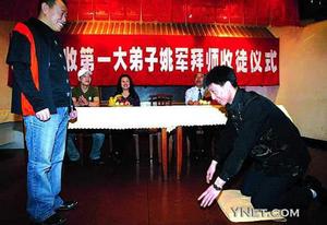 正式的拜師儀式簡短、熱烈,擲地有聲的三叩首表達(dá)了徒弟歸于師父門下的誠意,隨后,師徒二人互贈紀(jì)念品,徒弟將金畫《雄鷹展翅》贈予師父,而師父則將自己的小品專輯以及電視劇《正月里來是新春》的光碟回贈給徒弟,目的是希望他今后堅持演文明戲,演有尊嚴(yán)、有人格的作品,做一個德藝雙馨的藝人。