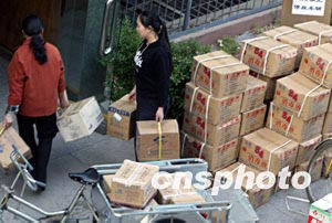 北京市出現(xiàn)新的SARS疫情后,許多批發(fā)商販聞風(fēng)而動(dòng)緊急進(jìn)貨SARS消毒液。四月二十三日下午,北京西城區(qū)天意市場(chǎng)的一家商販將新進(jìn)的“84消毒液”運(yùn)進(jìn)貨柜。“84消毒液”是北京地壇醫(yī)院研制的專門殺滅肝炎病毒的消毒液,對(duì)殺滅SARS病毒有明顯效果。中新社記者:任晨鳴
