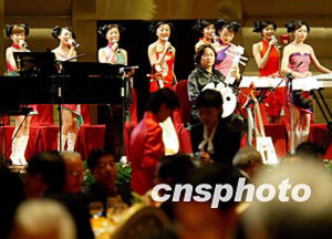 晚宴結(jié)束時(shí),前來(lái)參加年會(huì)的美國(guó)前總統(tǒng)喬治·布什,走上主席臺(tái)與民樂(lè)演奏家們進(jìn)行切磋。這位曾經(jīng)長(zhǎng)期擔(dān)任駐中國(guó)大使的老政治家,透露出對(duì)中國(guó)民間音樂(lè)的熱愛。