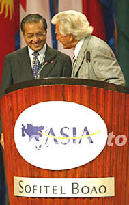 四月二十四日,馬來(lái)西亞前總理馬哈蒂爾(左)在博鰲論壇領(lǐng)導(dǎo)人峰會(huì)上發(fā)表演講后,在主持人霍克的要求下接受現(xiàn)場(chǎng)提問(wèn)。中新社記者:鄭萍萍