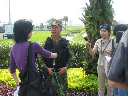 博鰲亞洲論壇2004年年會于4月24日在海南博鰲開幕。本次論壇年會主題為“亞洲尋求共嬴——一個對世界開放的亞洲”,表明2004年博鰲亞洲論壇年會將在全球背景下,探討亞洲各國和地區(qū)區(qū)域經濟合作問題,尋求亞洲共同進步的有效途徑。圖為記者采訪負責博鰲亞洲論壇安全保衛(wèi)工作的“鐵甲軍人”。(春風)