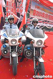 《中華人民共和國(guó)道路交通安全法》五月一日正式實(shí)施。四月二十五日,十余萬(wàn)北京民眾走上街頭宣傳這一法規(guī)。威武的警員成為龐大宣傳隊(duì)伍中最為吸引人目光的焦點(diǎn)。中新社記者:任海霞