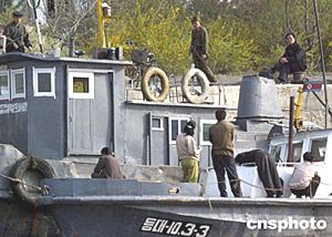 朝鮮士兵在與中國丹東隔鴨綠江相望的朝鮮碼頭執(zhí)勤。中新社記者:宋吉河