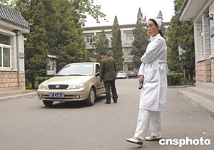 北京地壇醫(yī)院從四月二十二日收治新的“非典”患者后,正常門診病人數(shù)量顯著下降。四月二十五日,雖人車稀少,但在醫(yī)院大門口檢測體溫的劉淑敏女士依然堅守崗位。中新社記者:鄒憲