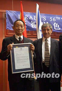 中國(guó)國(guó)家雜交水稻工程技術(shù)研究中心主任袁隆平教授被授予2004年度沃爾夫農(nóng)業(yè)獎(jiǎng),以獎(jiǎng)勵(lì)他在雜交水稻方面所進(jìn)行的革新性培育和對(duì)雜交優(yōu)勢(shì)遺傳基礎(chǔ)的發(fā)現(xiàn)。四月二十六日晚在北京舉行的慶祝以色列國(guó)獨(dú)立五十六周年招待會(huì)上,由以色列駐華大使海逸達(dá)博士(右)親自向給袁隆平教授(左)轉(zhuǎn)交以色列教育、文化及體育部長(zhǎng)和沃爾夫基金會(huì)理事會(huì)主席莉默.利維納特女士給袁隆平教授的獲獎(jiǎng)信。中新社記者:張勤
