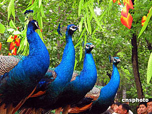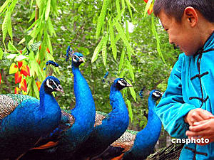 動(dòng)物大巡游,是山東濟(jì)南動(dòng)物園“五·一”黃金周的主打節(jié)目,豐富的表演形式,眾多的動(dòng)物種類,讓游客大飽眼福。2004年5月3日,讓人喜愛的藍(lán)孔雀站在巡游花車上傲氣十足。希牛 攝