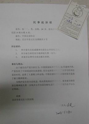 目前,他已聘請(qǐng)了知名律師,寫好了起訴狀書,要求法院判決中國(guó)足協(xié)賠償他一分錢的精神損失費(fèi),“我已經(jīng)于8日下午向北京市崇文區(qū)人民法院立案庭以掛號(hào)信的方式遞交了起訴書!”