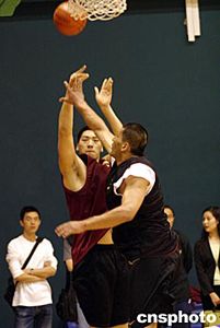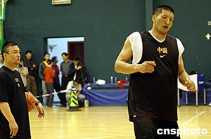五月十一日,備戰(zhàn)雅典奧運(yùn)會(huì)的中國(guó)國(guó)家男子籃球隊(duì)在北京進(jìn)行公開訓(xùn)練,剛剛回國(guó)的NBA球員巴特爾參加了合練。中新社記者:盛佳鵬