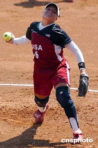 在當(dāng)?shù)貢r(shí)間8月19日舉行的壘球比賽中,美國隊(duì)選手里薩-費(fèi)爾南德茲使出全身力氣奮力一投。